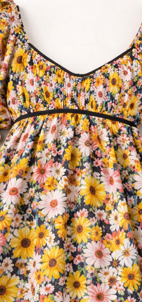 This romantic floral mini dress by For Love & Lemons is a beautifully crafted statement piece designed with thoughtful details and a feminine silhouette. Made from a lightweight satin fabric, this dress features a contoured bust and softly structured puff sleeves finished with adjustable tie details at the cuffs for a delicate, vintage-inspired touch.