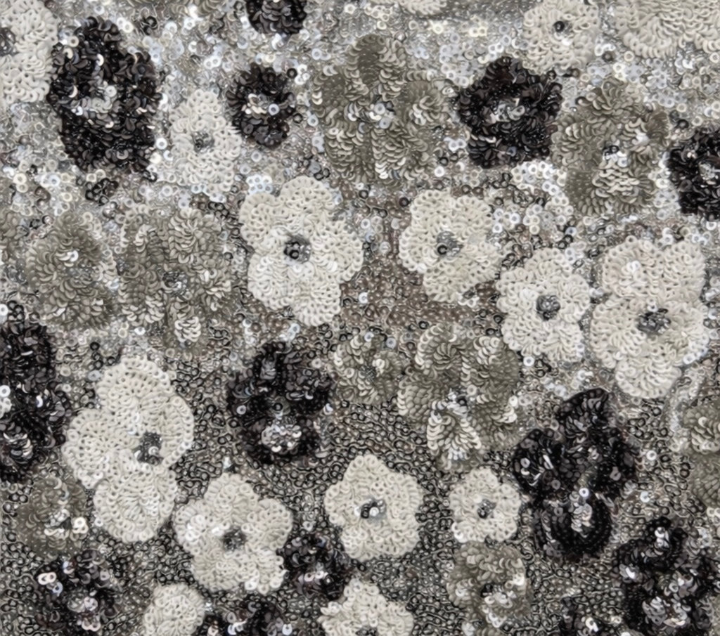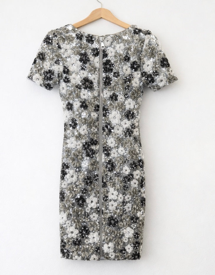 Make a statement in this shimmering silver sequin floral shift dress by Le Superb, curated for our boutique finds collection. Designed with intricate allover sequin embroidery, this piece features dimensional floral motifs that catch the light beautifully, creating a striking yet refined silhouette.