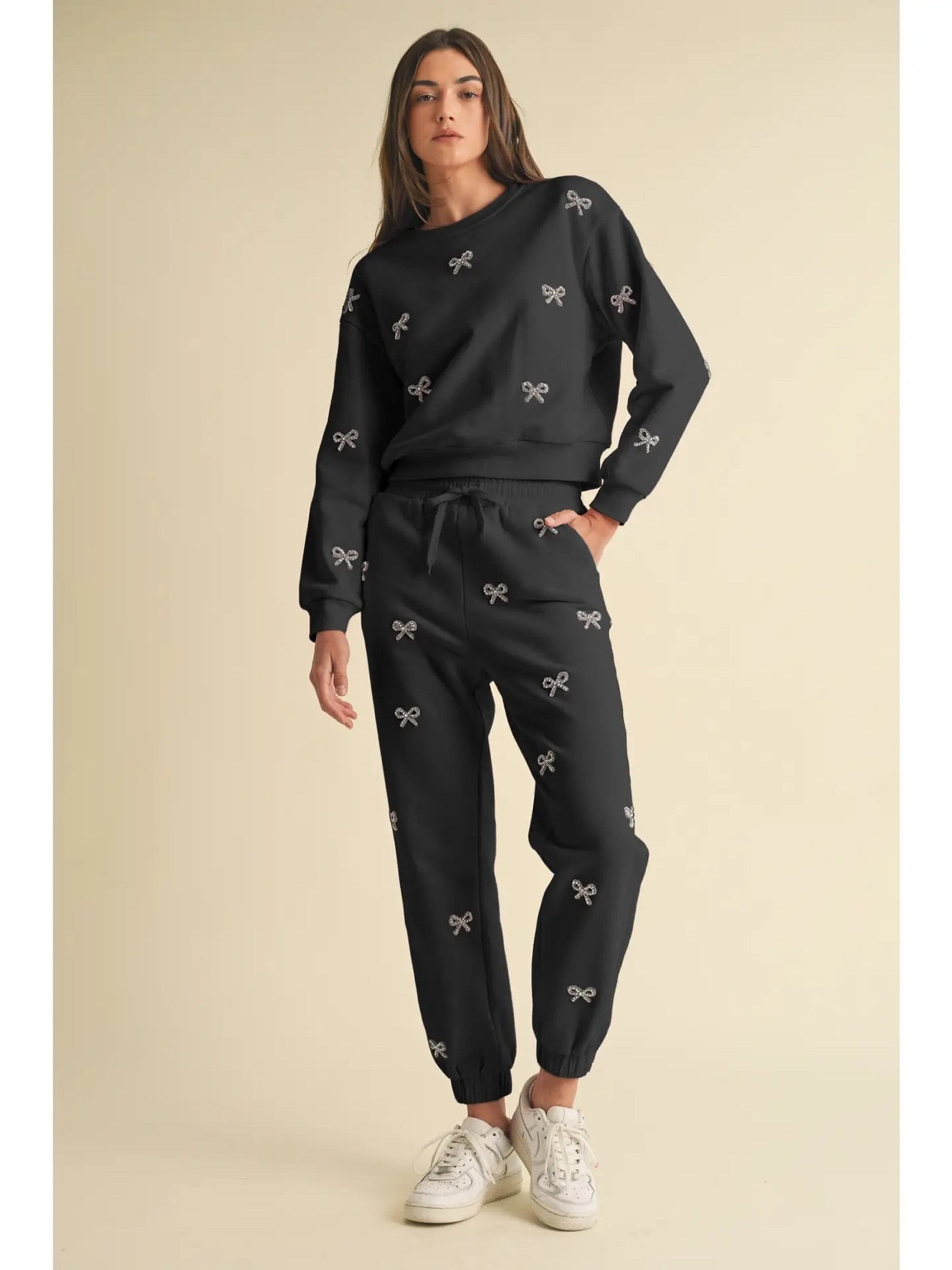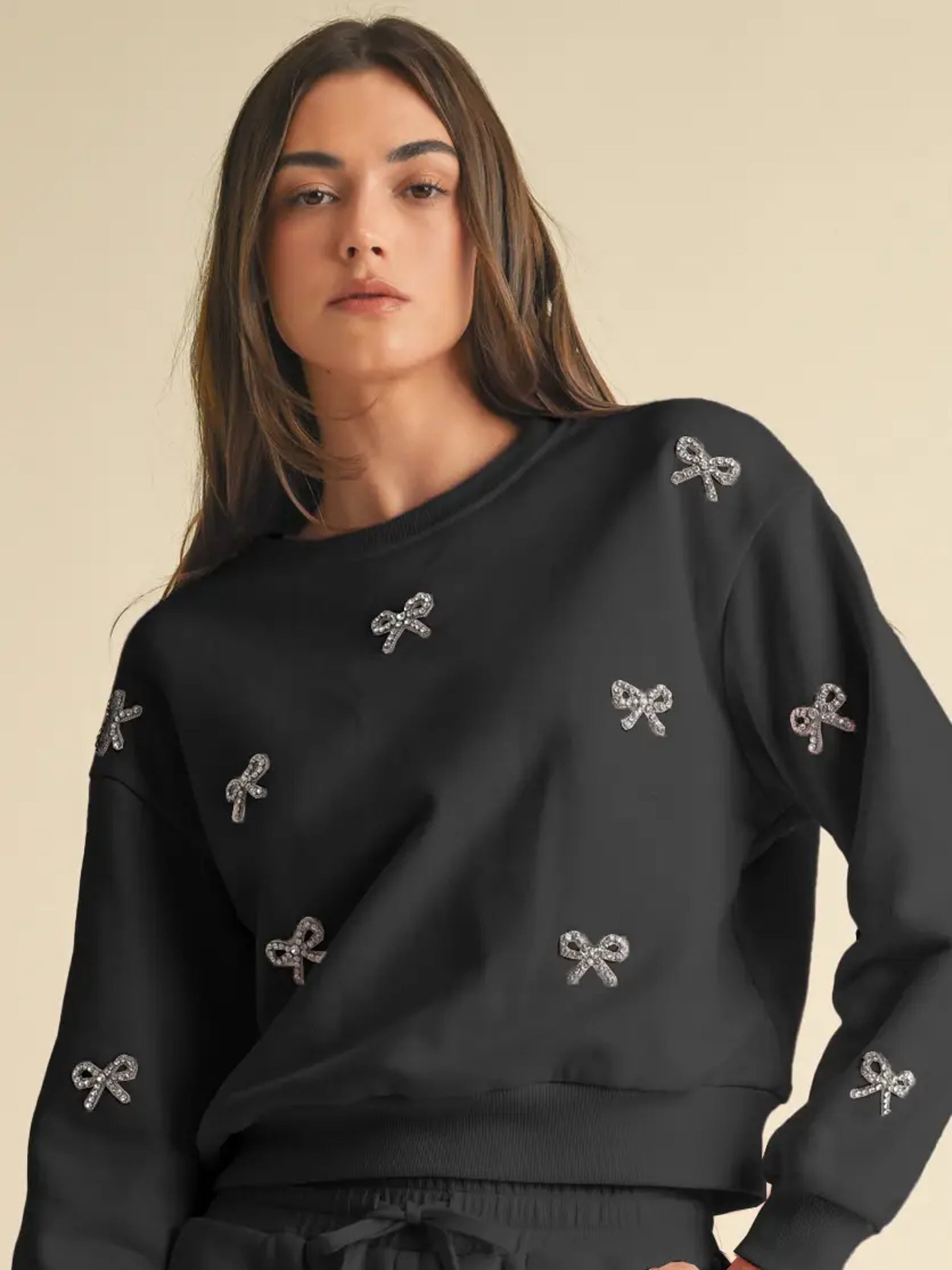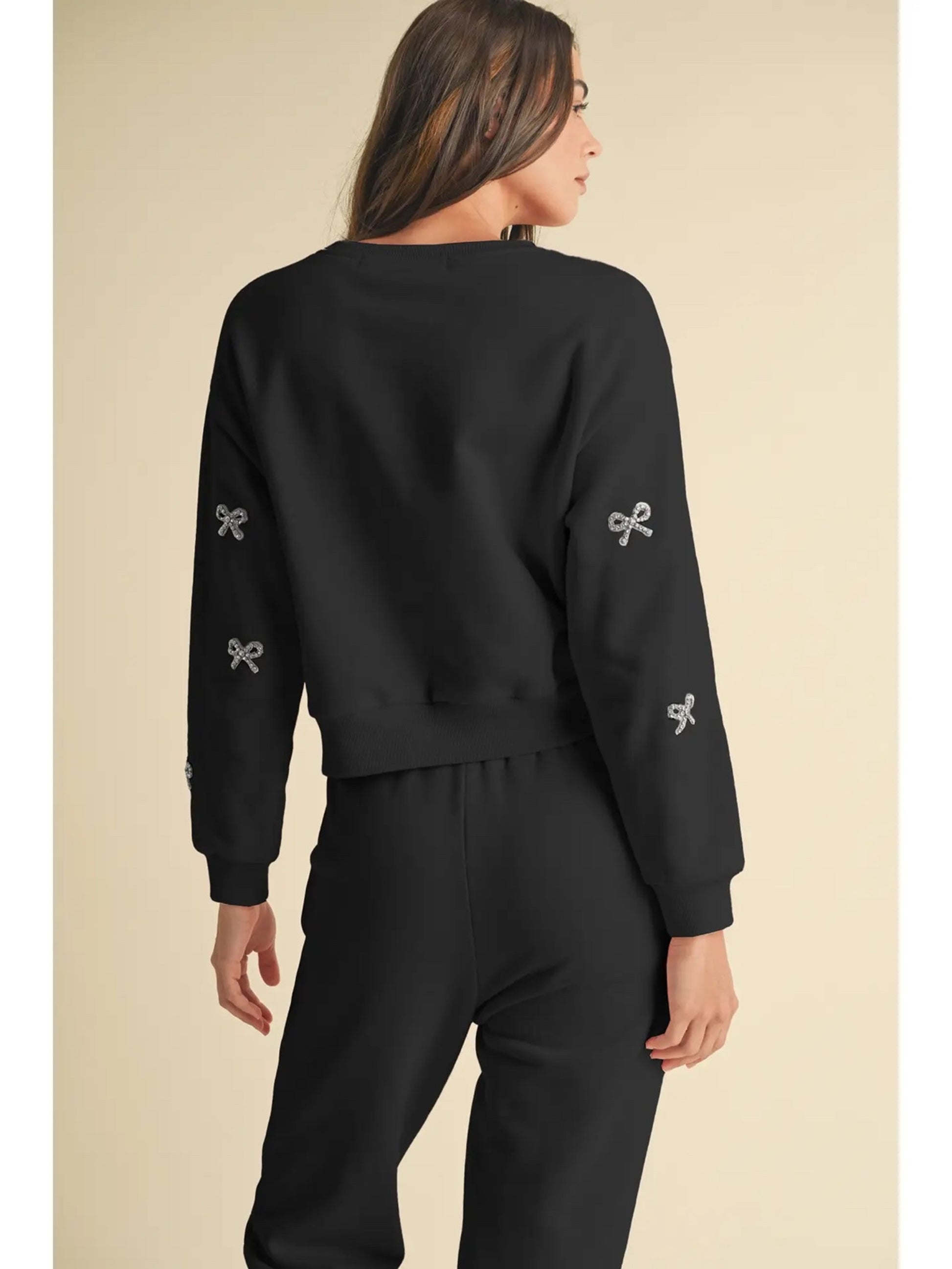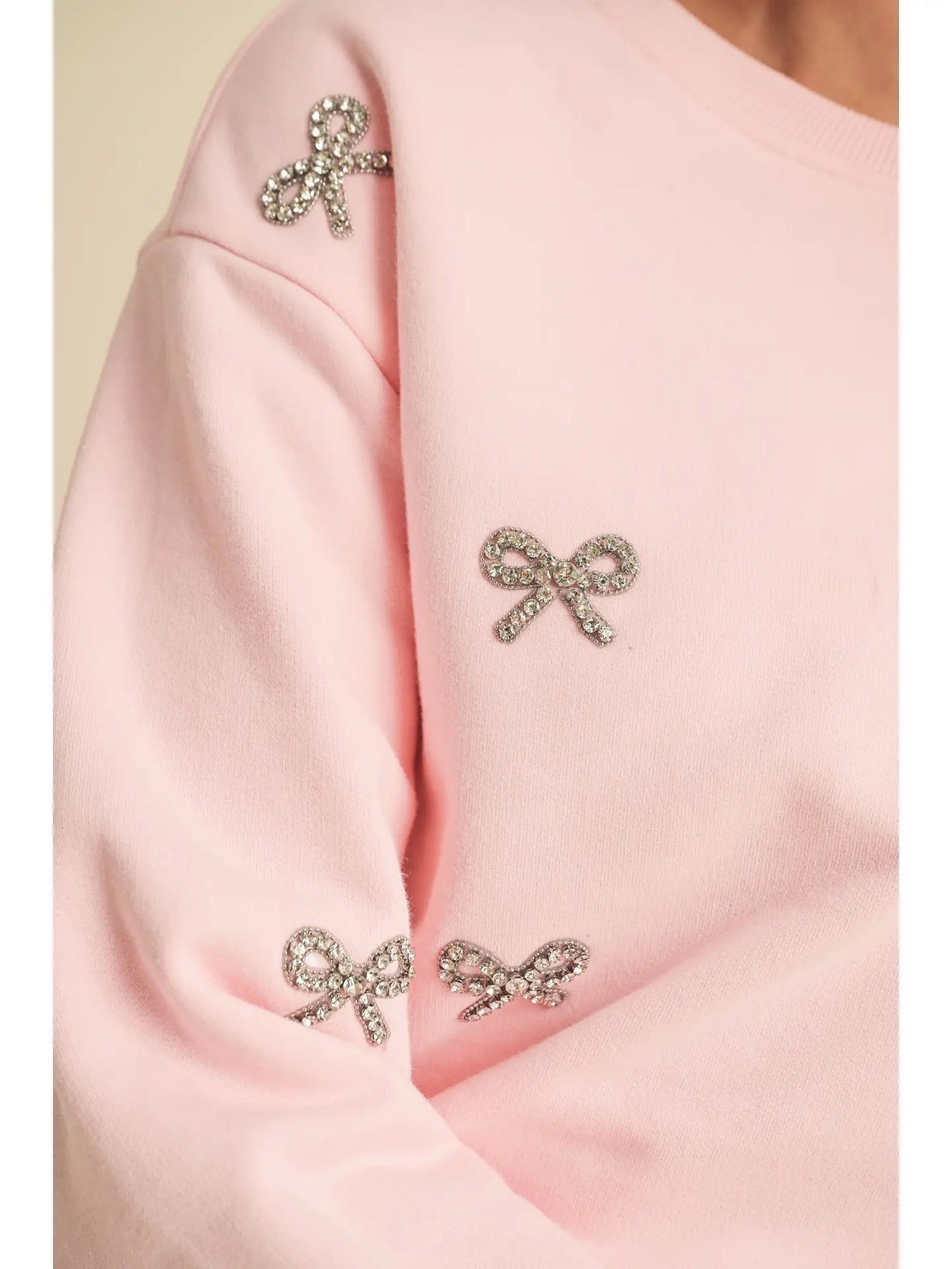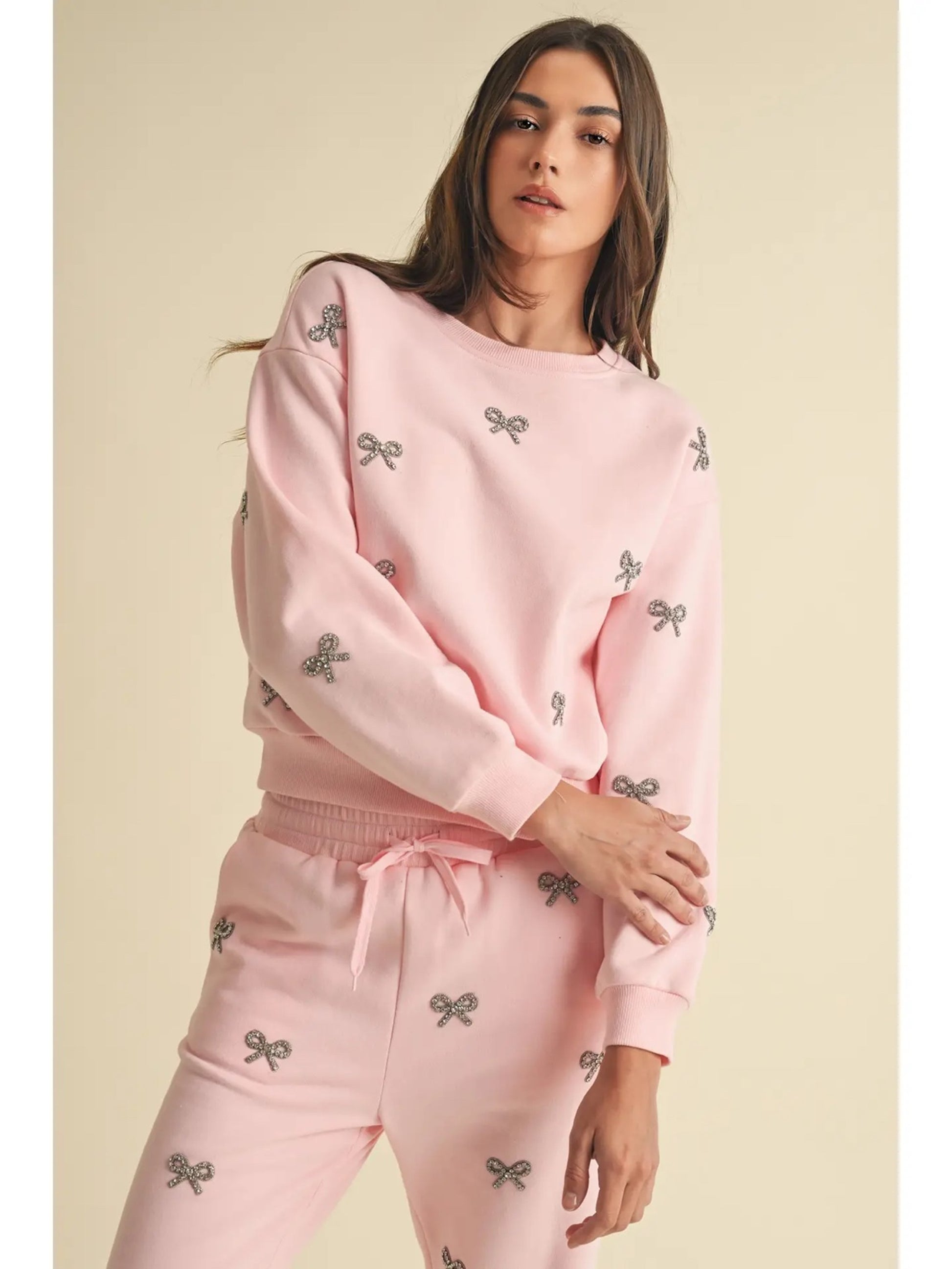 Step into cozy luxury with this ultra-soft pink crewneck, designed to bring a little sparkle to your everyday. Adorned with shimmering rhinestone bow embellishments across the front, sleeves, and back, this sweatshirt blends playful charm with elevated style.