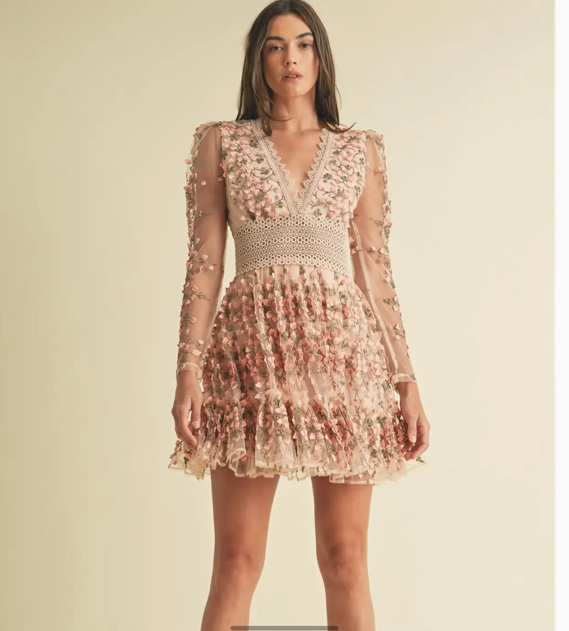 Step into effortless elegance with this dreamy floral embroidered mini dress, designed to capture a soft boho romance. Crafted from delicate sheer mesh, this feminine silhouette features intricate 3D floral embroidery throughout for a beautifully textured, couture-inspired finish. The deep V-neckline is trimmed with lace detailing, drawing the eye while maintaining a refined, romantic feel.
