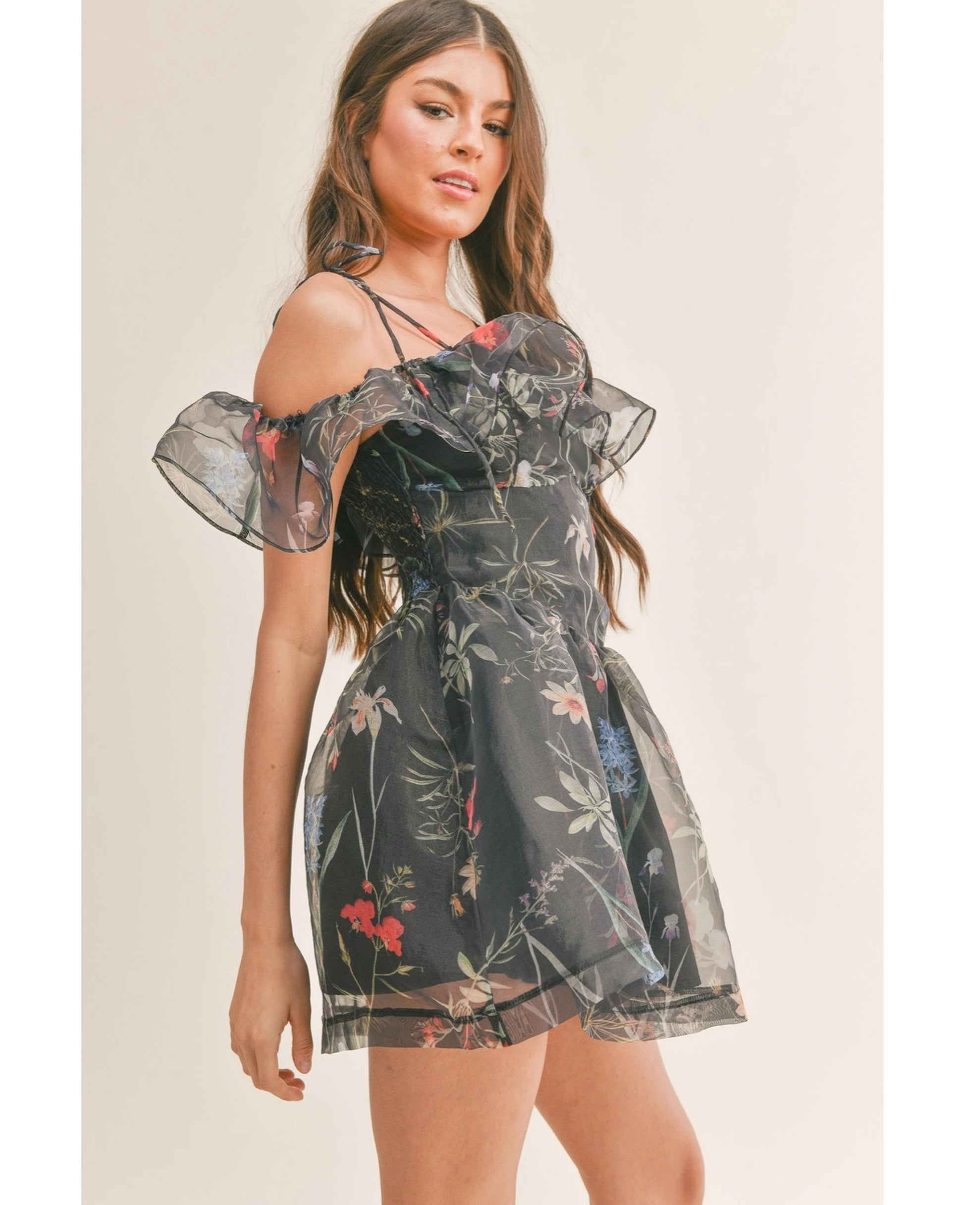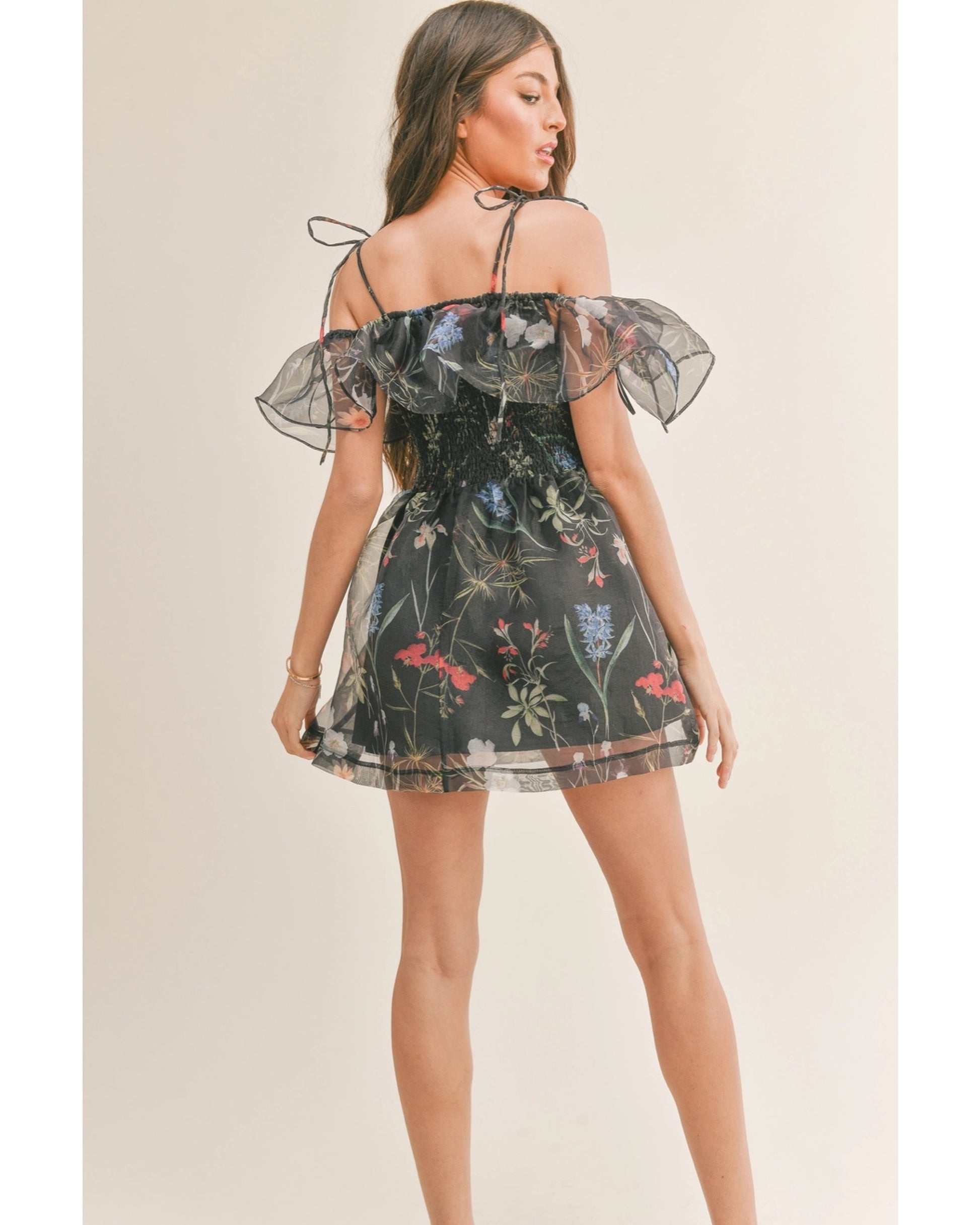 Turn heads in the Midnight Garden Off-Shoulder Floral Mini Dress, a dreamy, feminine piece made for romantic nights, summer parties, and special moments. Featuring a sheer floral overlay with a soft ruffle neckline and delicate tie straps, this dress creates the most flattering, floaty silhouette.
