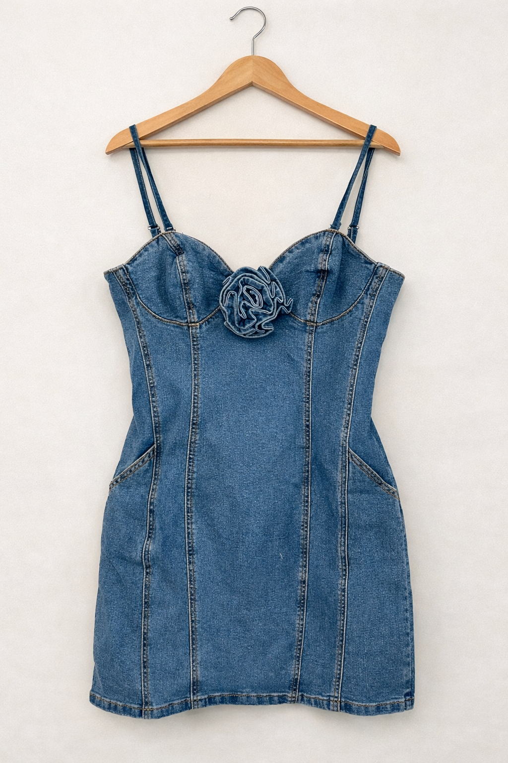 Turn heads in this statement-making denim mini that blends vintage romance with modern edge. Featuring a sculpted corset-style bodice and a soft denim rose appliqué at the bust, this piece is designed to flatter while standing out. The structured seams create a beautiful hourglass shape, while adjustable spaghetti straps allow for a custom fit.