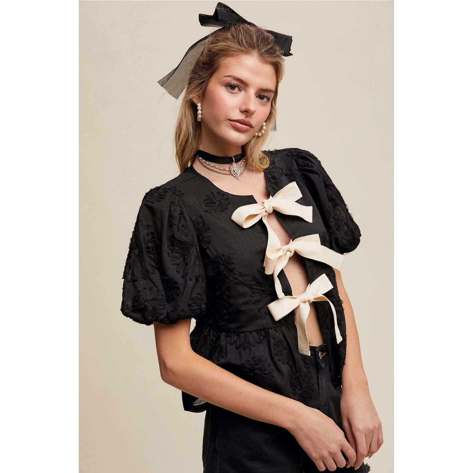 The Black Lace Bow Front Peplum Top is a statement piece designed to turn heads. Crafted from delicate embroidered lace, this blouse features three soft ivory bow ties down the front, creating a stunning open-front detail that feels vintage, flirty, and effortlessly chic.