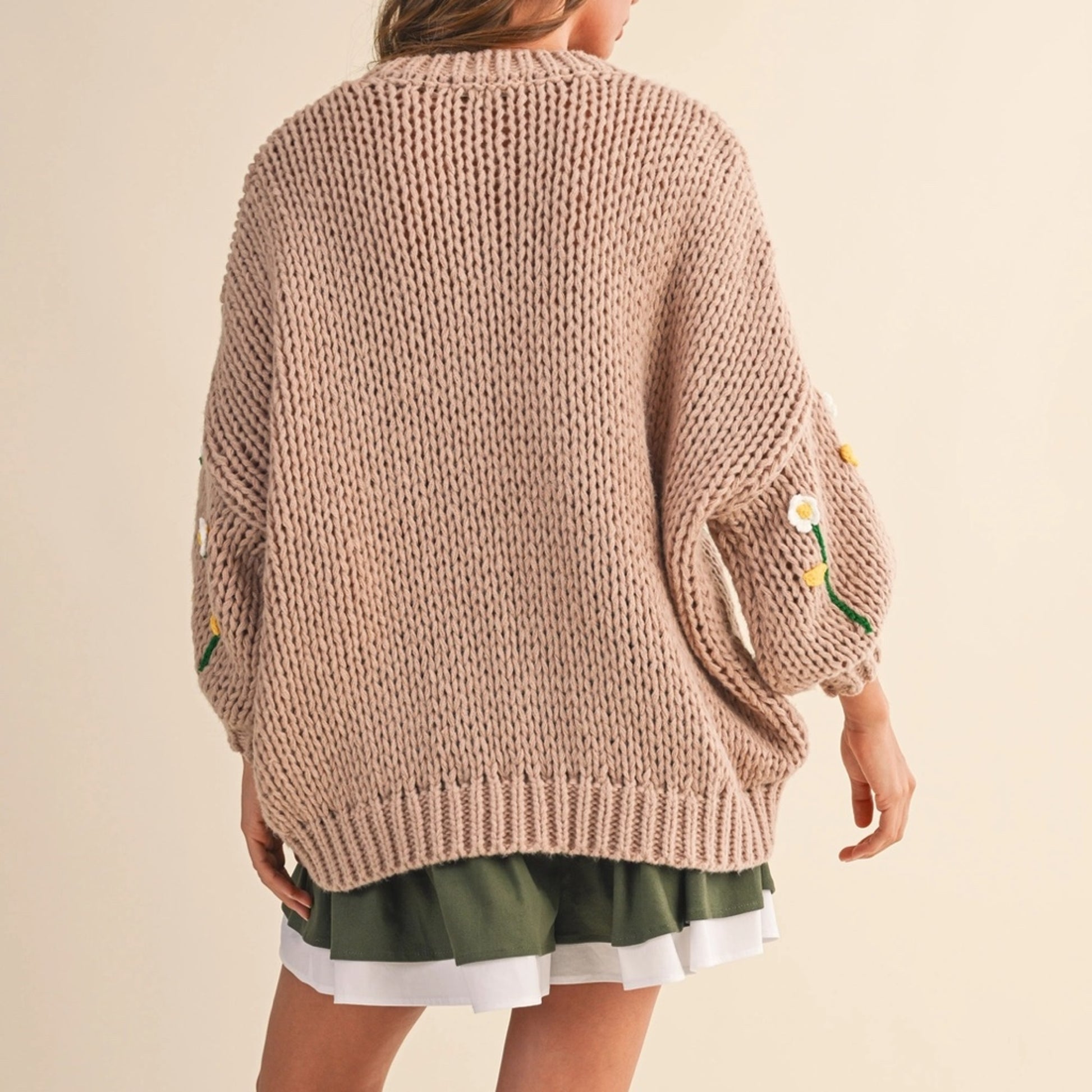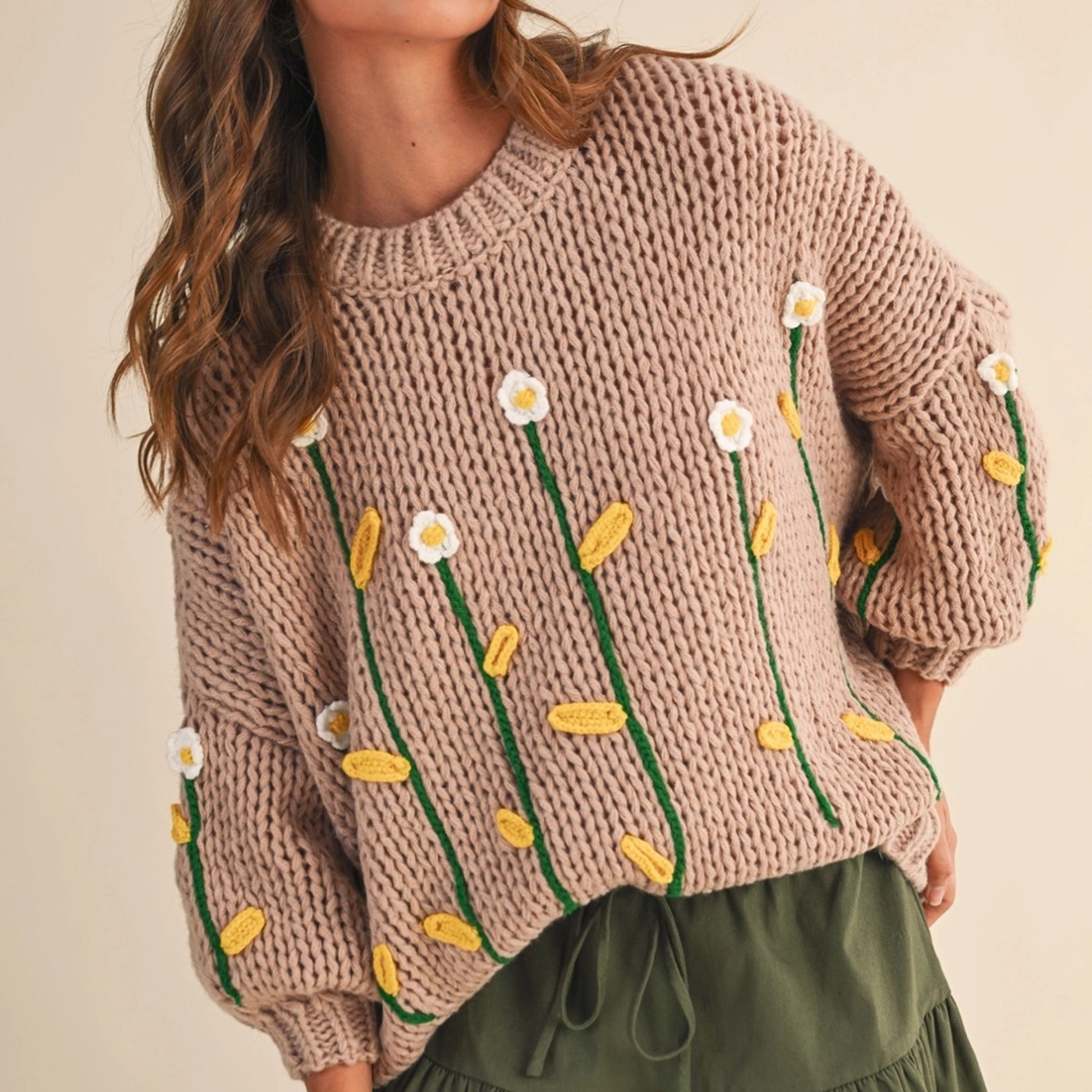 Soft, cozy, and beautifully detailed, the Daisy Meadow Embroidered Chunky Knit Sweater brings effortless boho charm to your everyday wardrobe. Crafted from a warm chunky knit, this sweater features delicate embroidered daisies that add a romantic, feminine touch while still feeling relaxed and wearable.