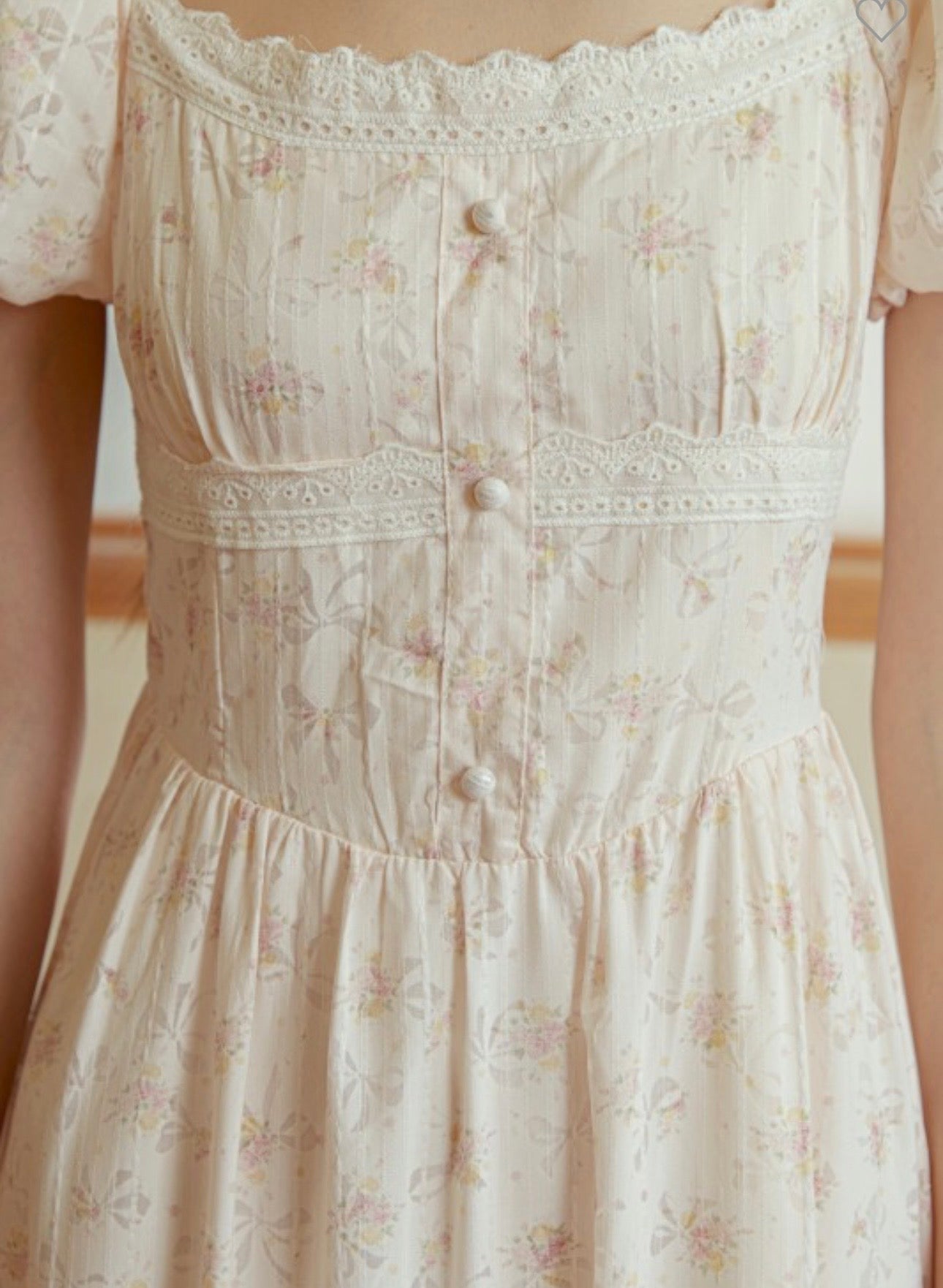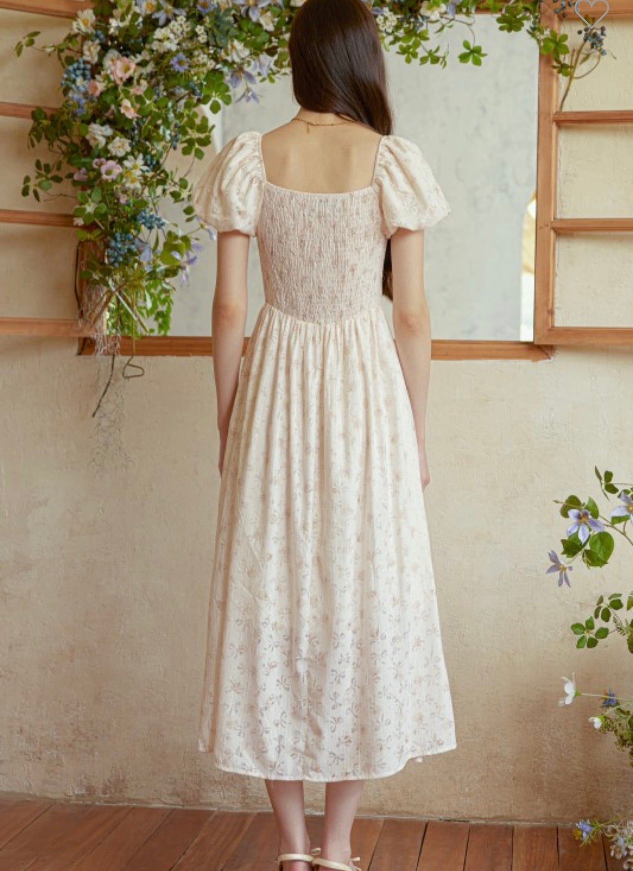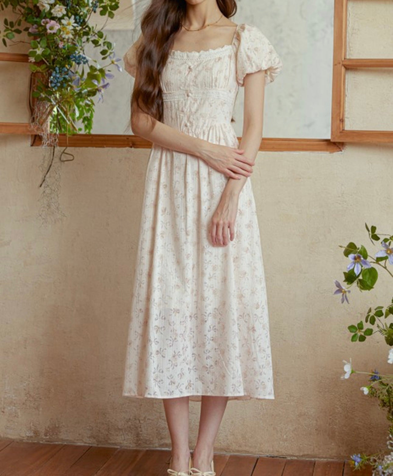This maxi dress features a soft, floral print, puff sleeves, and lace trimmed panels that give it a vintage, storybook feel.