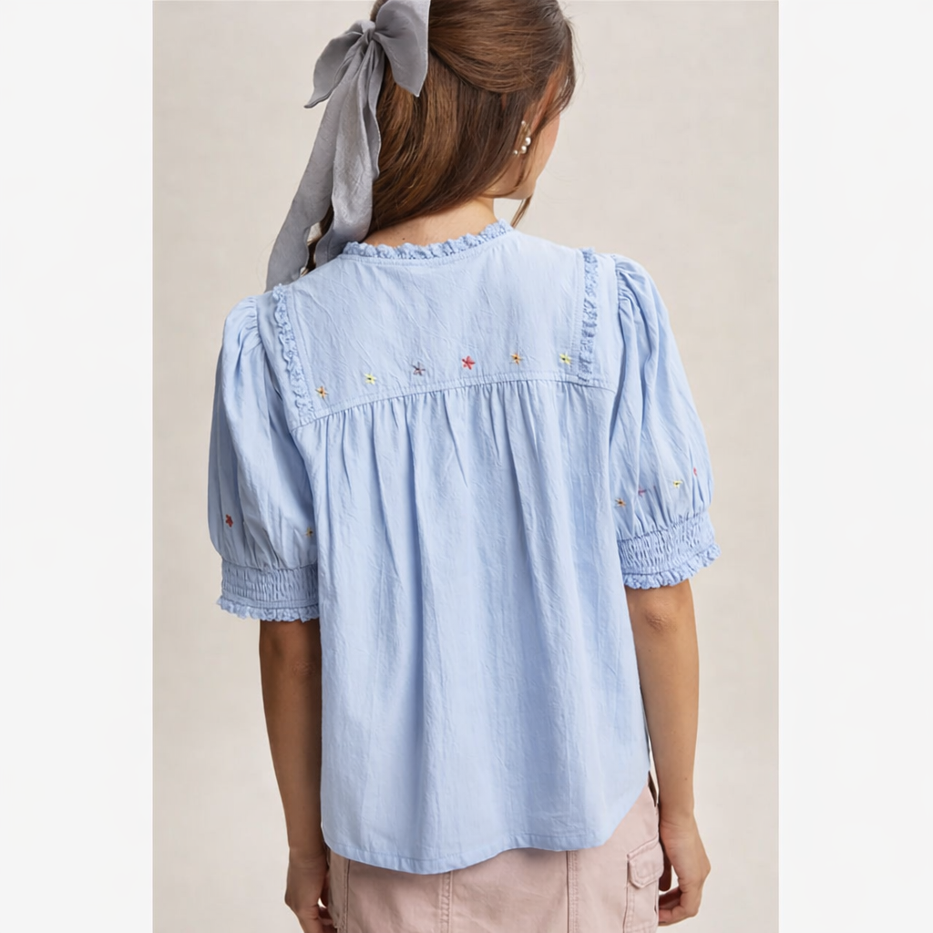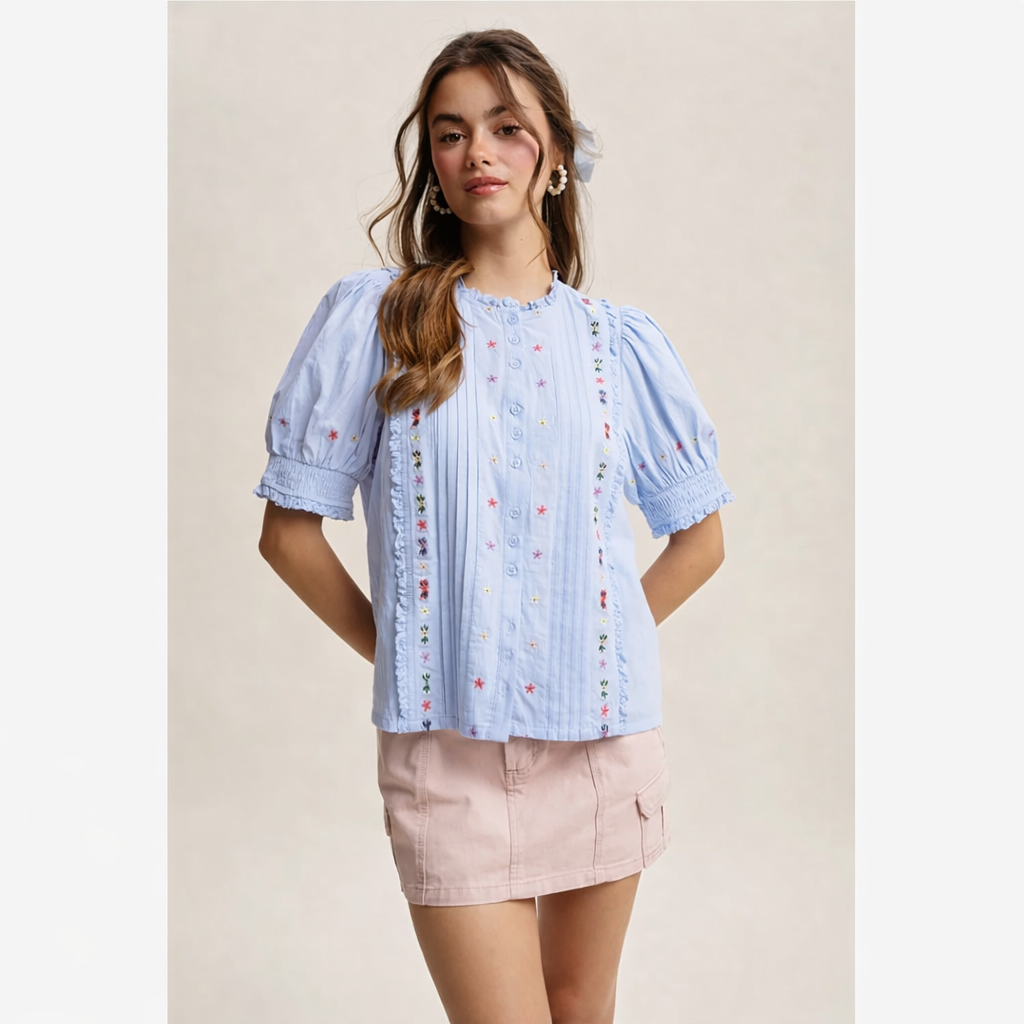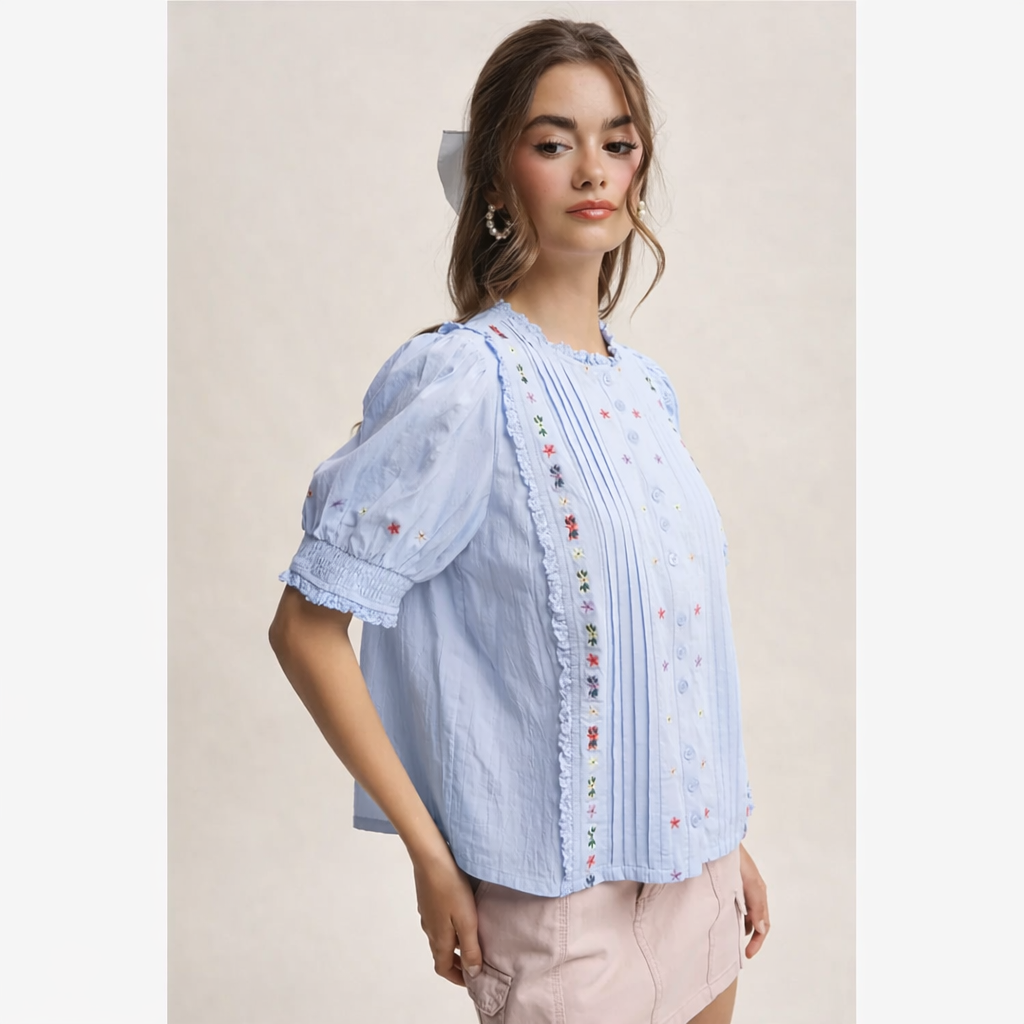 This light blue embroidered blouse features delicate floral stitching, pintuck pleats, and romantic puff sleeves for a soft boho look. Designed with a relaxed fit and lightweight fabric, it’s perfect for spring and summer outfits. Style with denim, skirts, or layered jewelry for an effortlessly feminine boutique aesthetic.