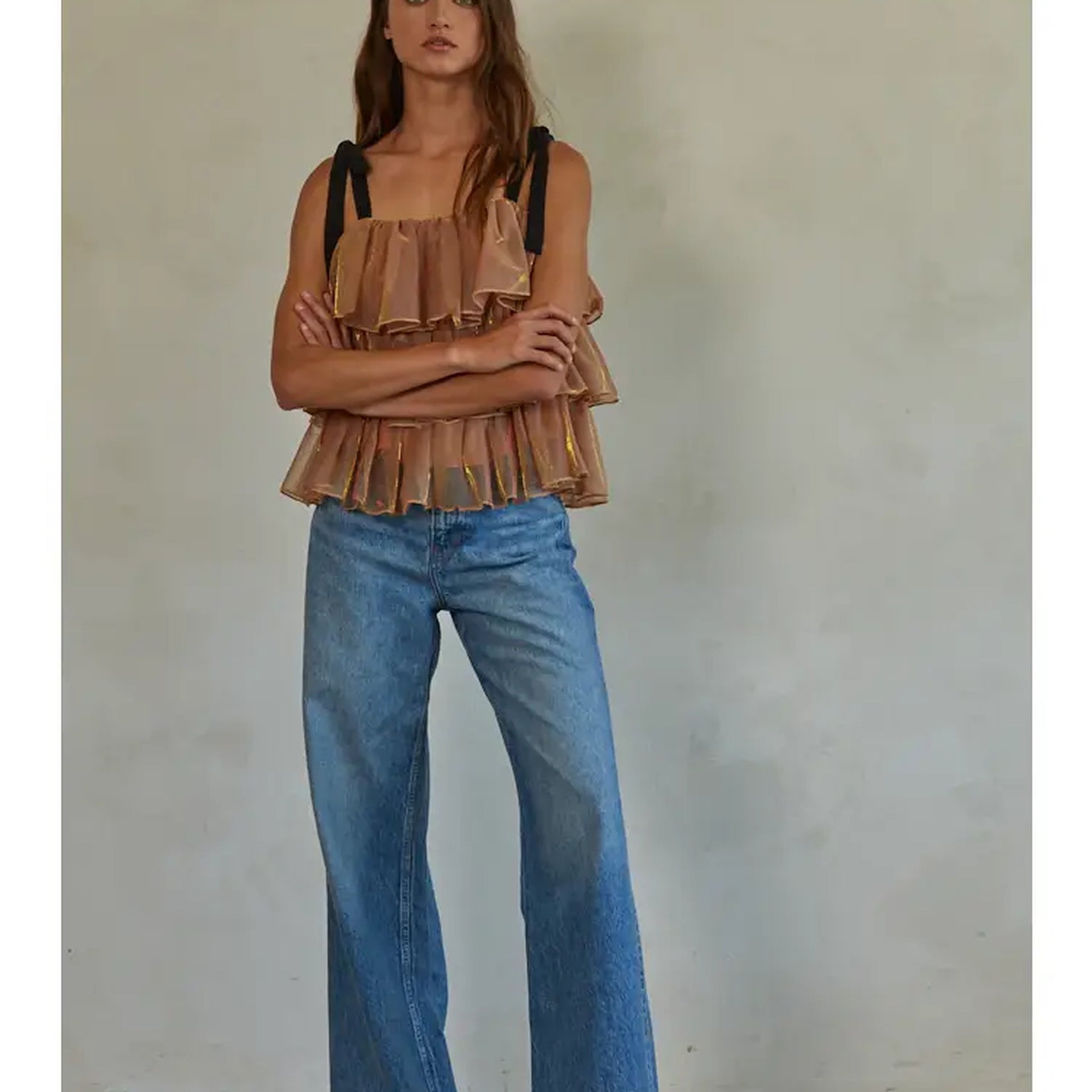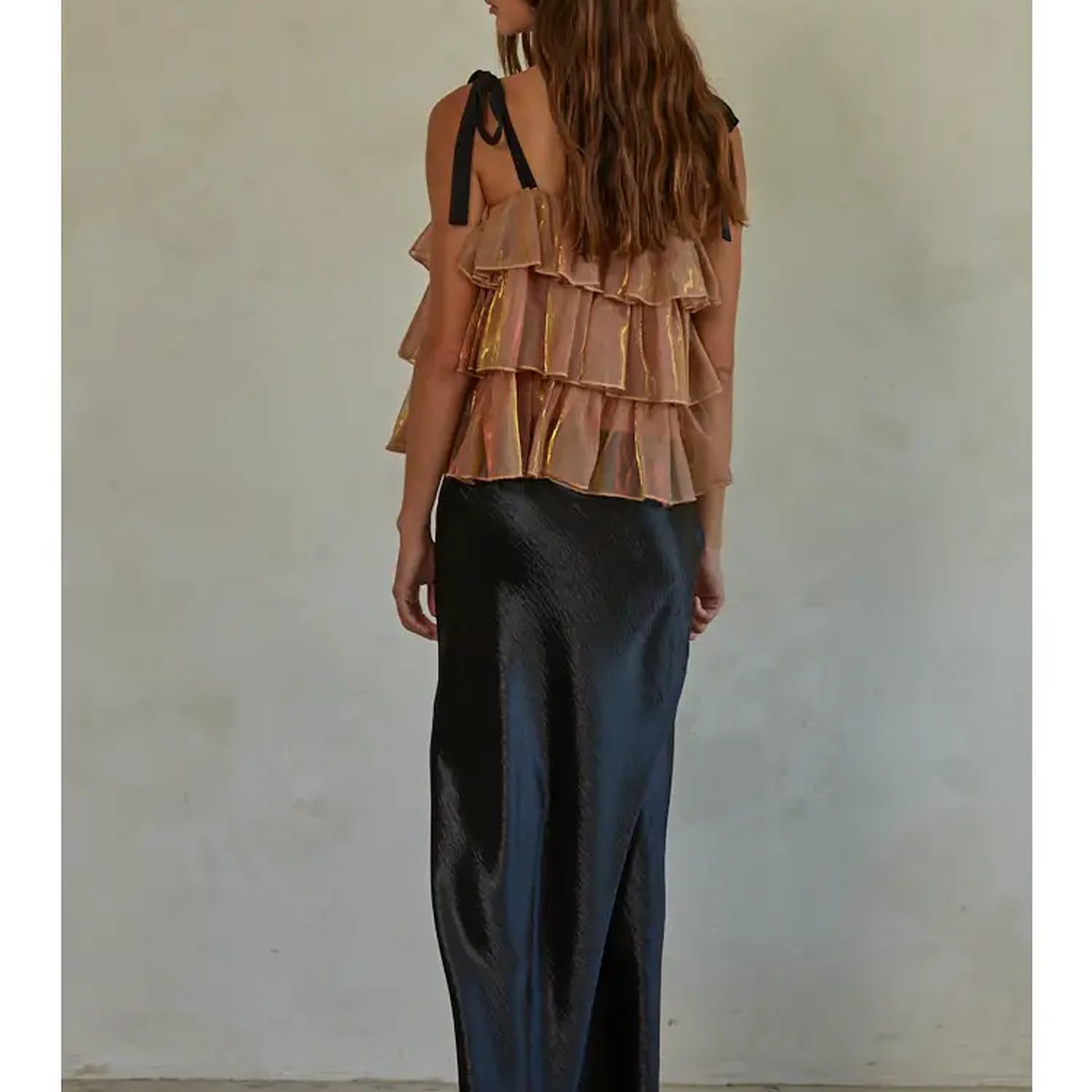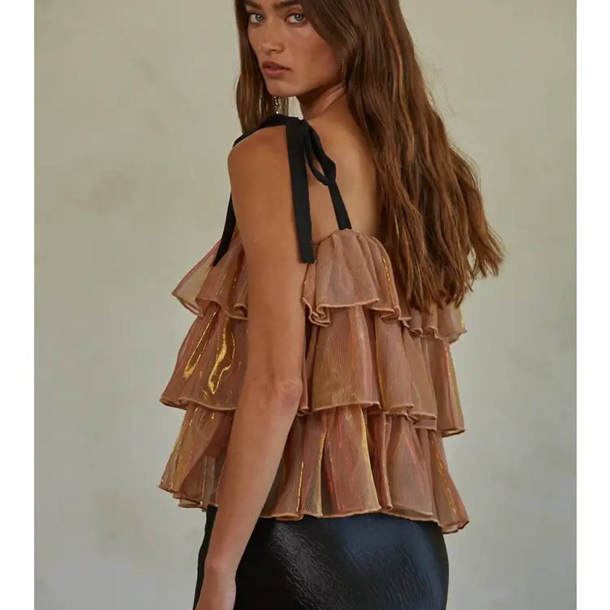 Make a statement in our Golden Hour Layered Metallic Mesh Top — a dreamy, feminine piece designed to catch the light with every movement. Crafted from airy woven mesh with subtle metallic detailing, this top features a flattering square neckline, adjustable tie shoulder straps, and cascading tiered ruffles for a soft, romantic silhouette.