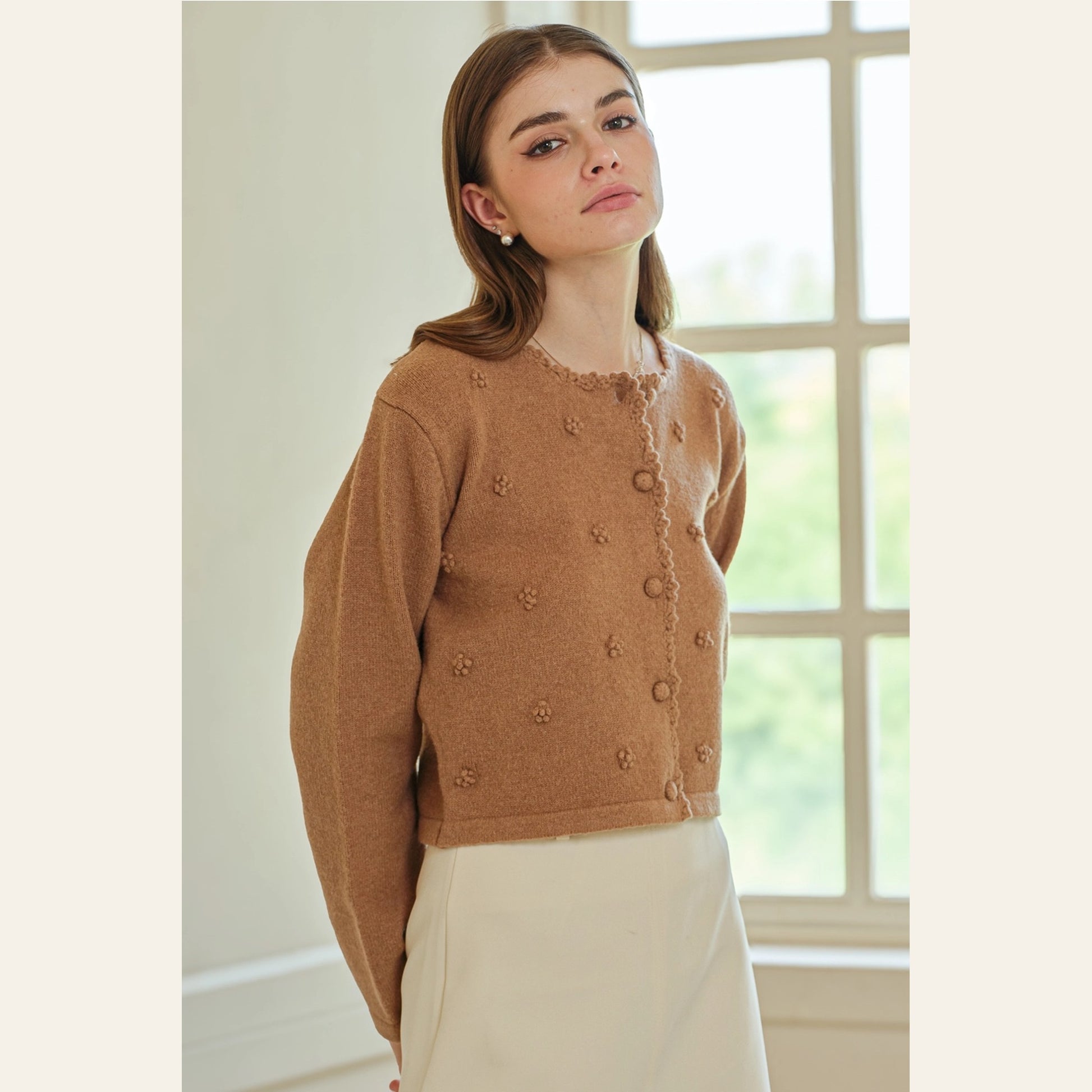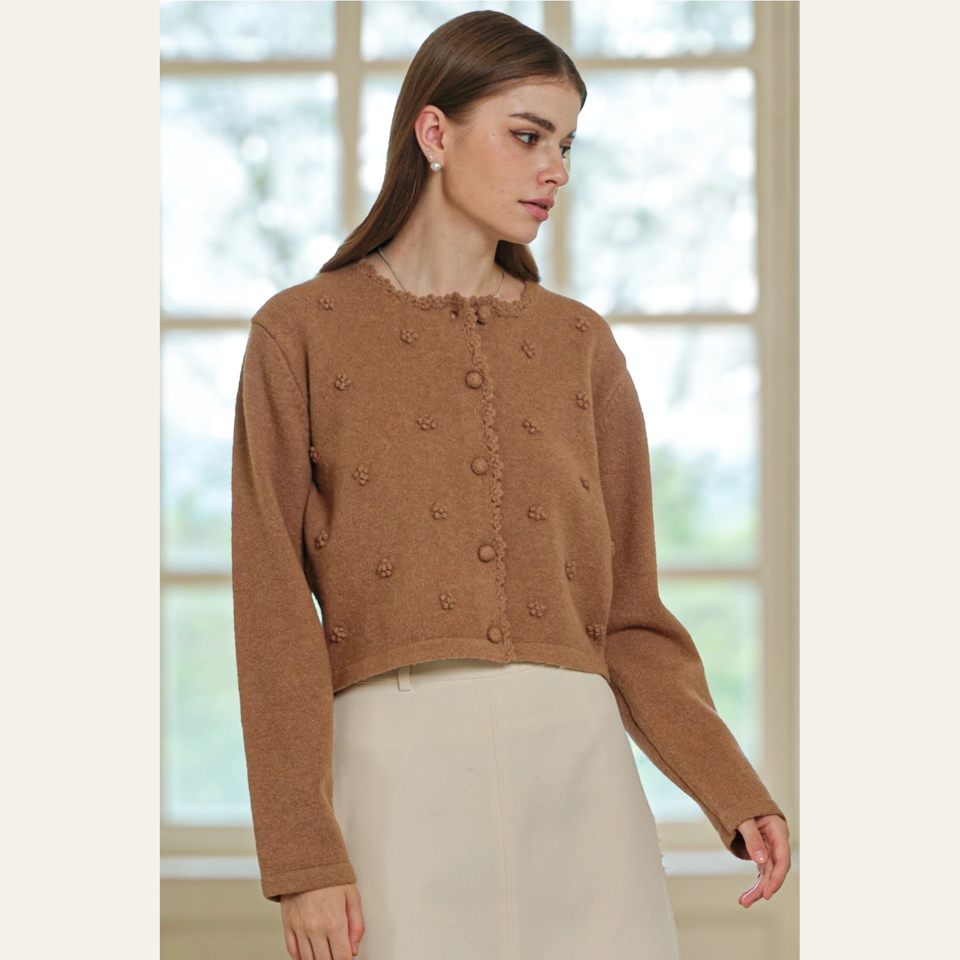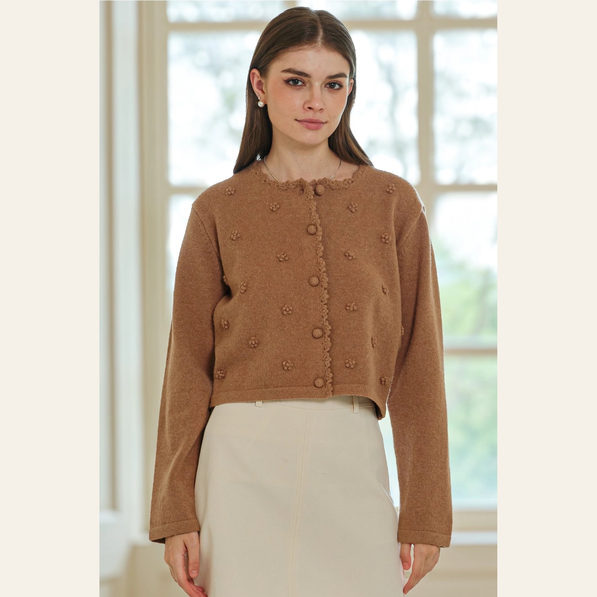 Softly structured with timeless charm, this textured knit cardigan is the perfect blend of cozy and refined. Designed with delicate floral bobble detailing throughout, it adds subtle dimension and a romantic finish to an everyday essential. The classic button-front silhouette and cropped length create a flattering shape that pairs effortlessly with high-waisted skirts, trousers, or denim.