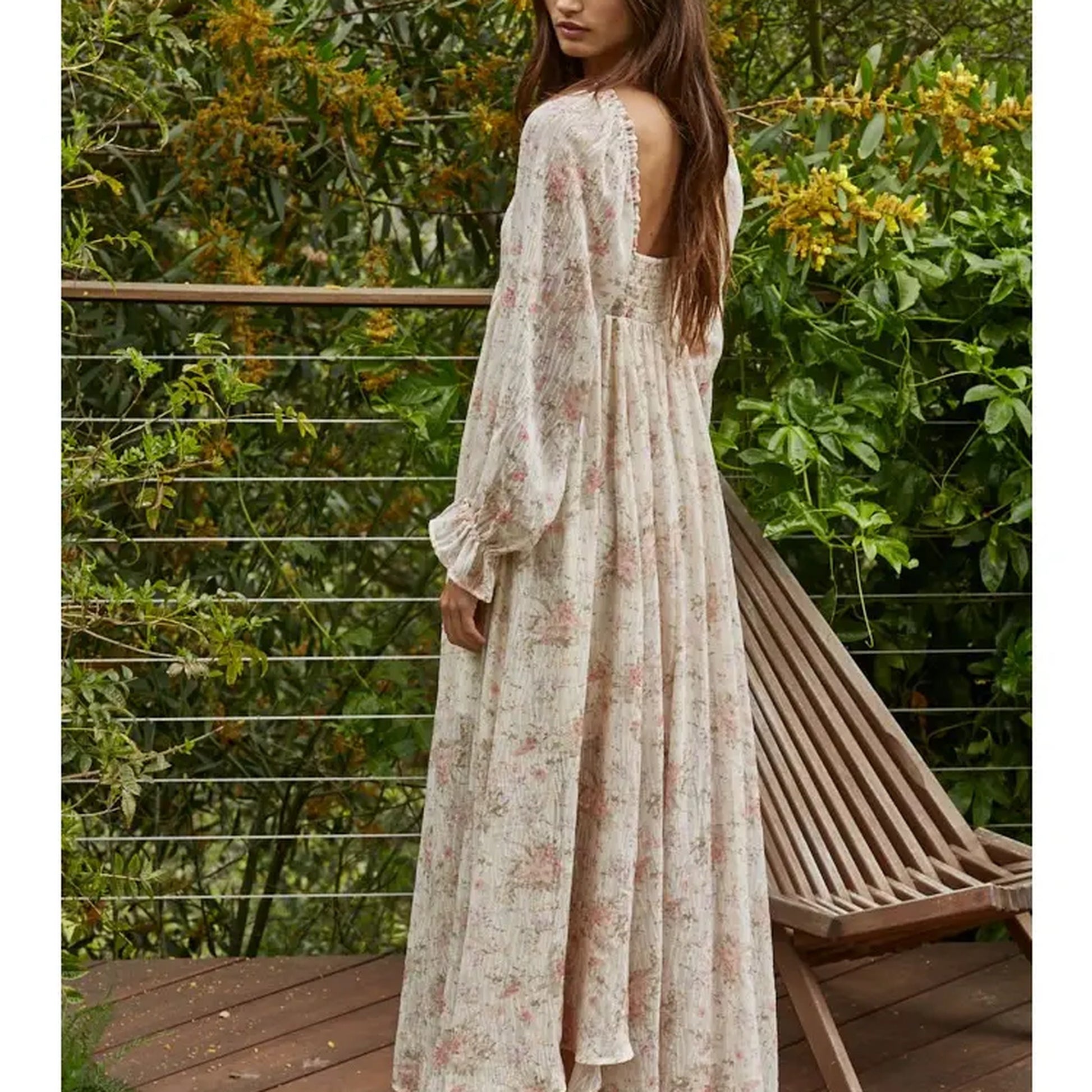 Float through the season in the Meadow Muse Floral Chiffon Maxi Dress — a dreamy, feminine silhouette designed for effortless elegance. Crafted from lightweight woven chiffon with a delicate floral print, this maxi features a flattering square neckline, long flowy sleeves with subtle flare cuffs, and a softly gathered skirt that moves beautifully with every step.