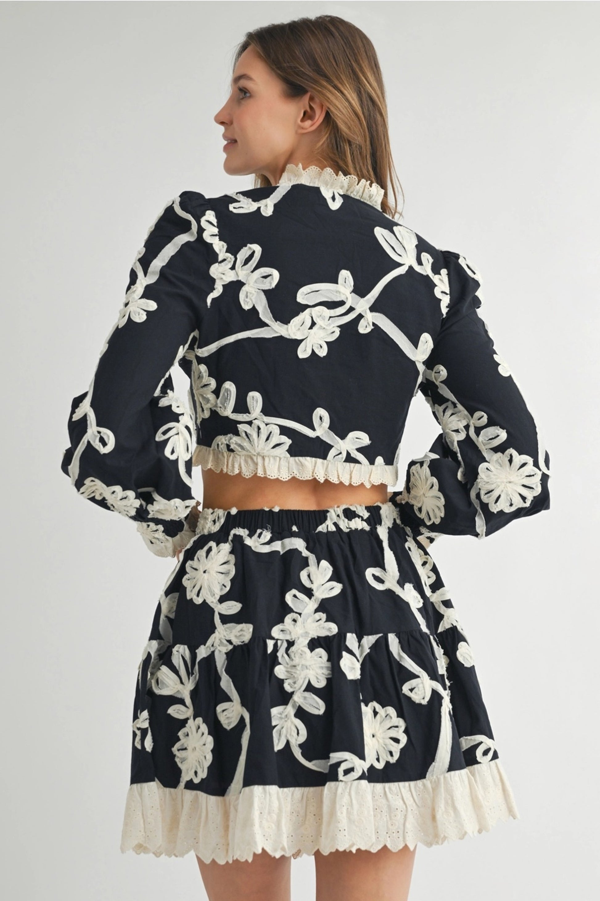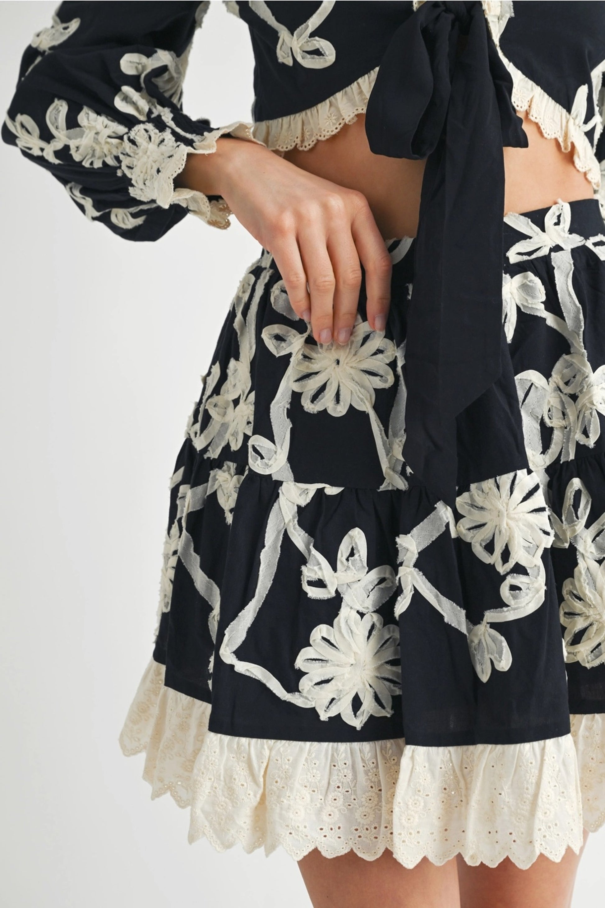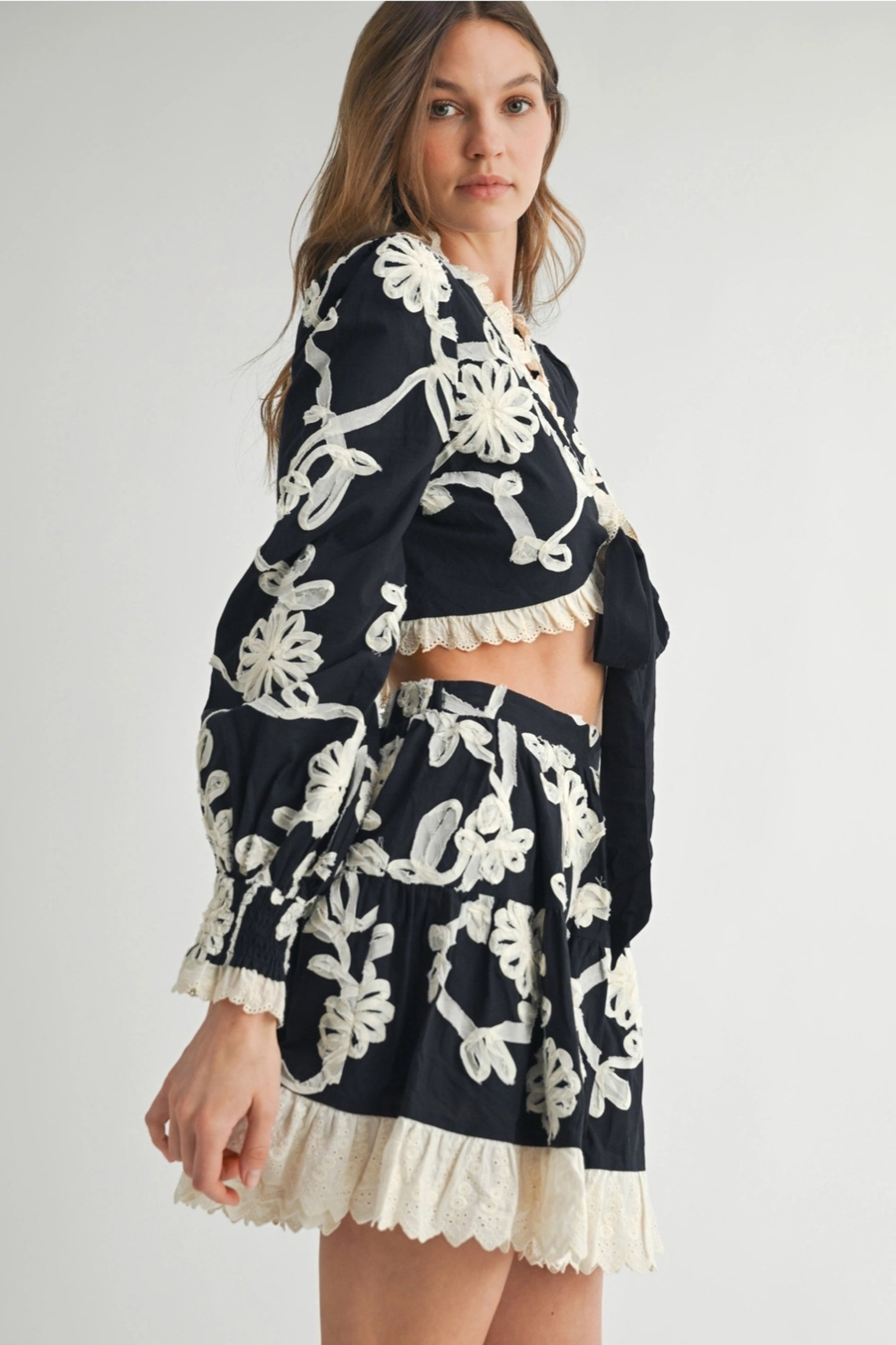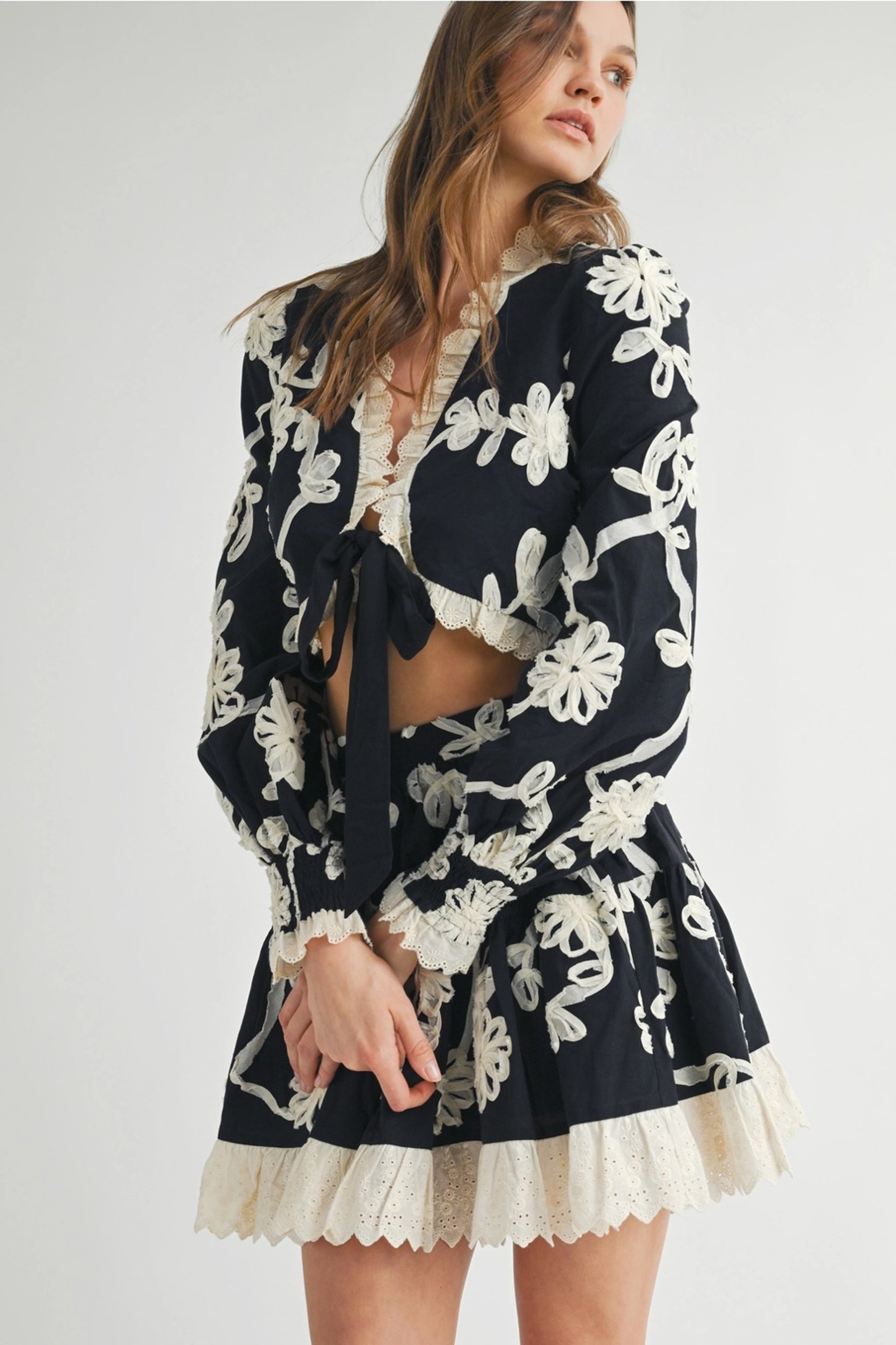 The cropped tie-front blouse is framed with scalloped lace trim and flowing long sleeves, while the high-waisted tiered mini skirt adds graceful movement with every step. Together, they create a flattering silhouette that feels effortlessly feminine and elevated.